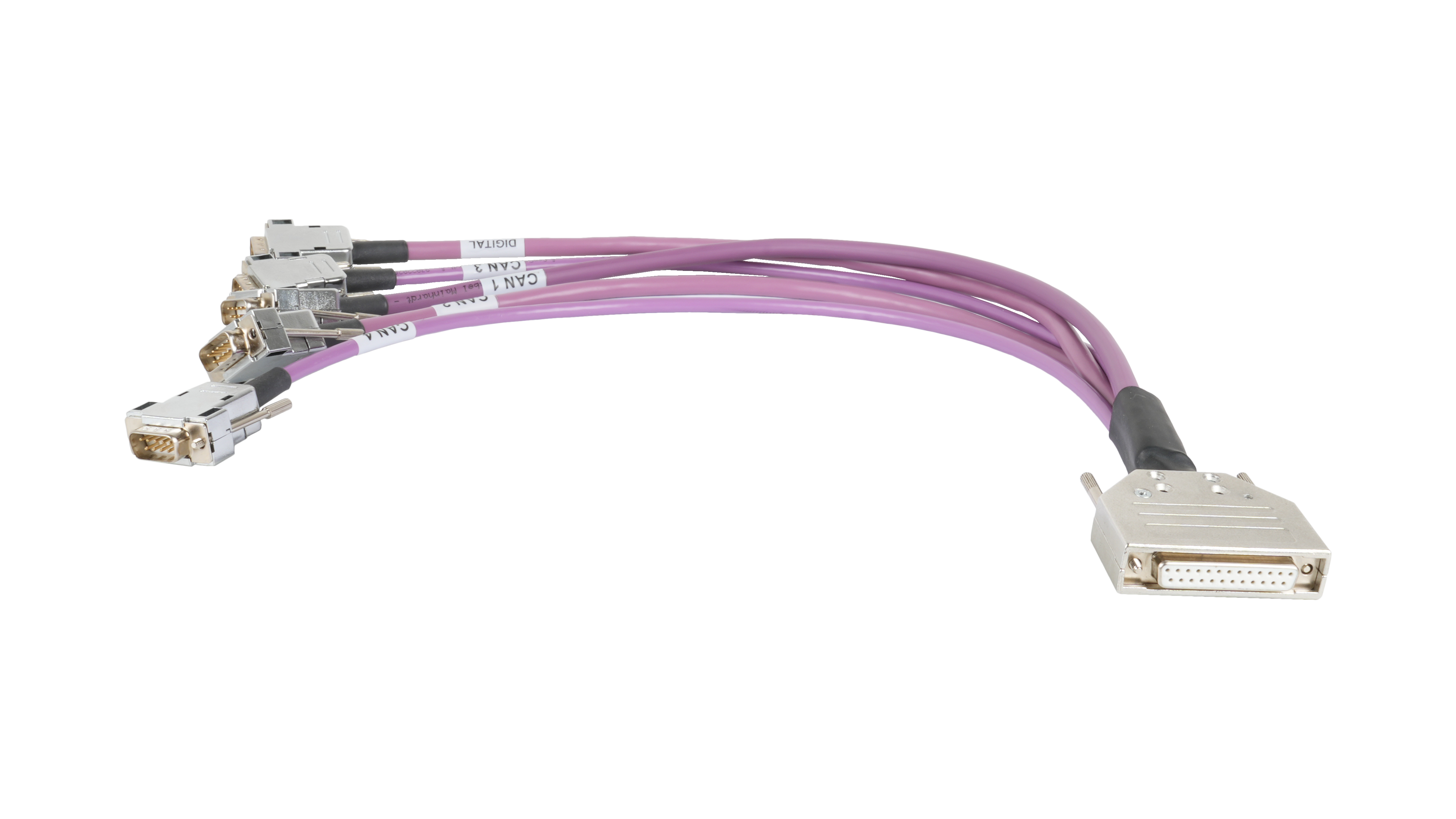 1.64ft/0.5m long shielded round cable with a 25-pin female D-Sub connector on one end, and five 9-pin male D-Sub connectors on the other end |